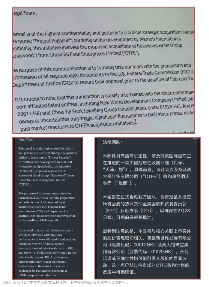 泄露邮件显示,此番收购代号定为“Project Pegasus”(天马计划),由万豪出马,计划自周大福手中接过瑰丽酒店集团的“权杖”;该笔交易与新世界发展和周大福珠宝的股价紧密相关,任何延迟都可能引发剧烈的股价波动。